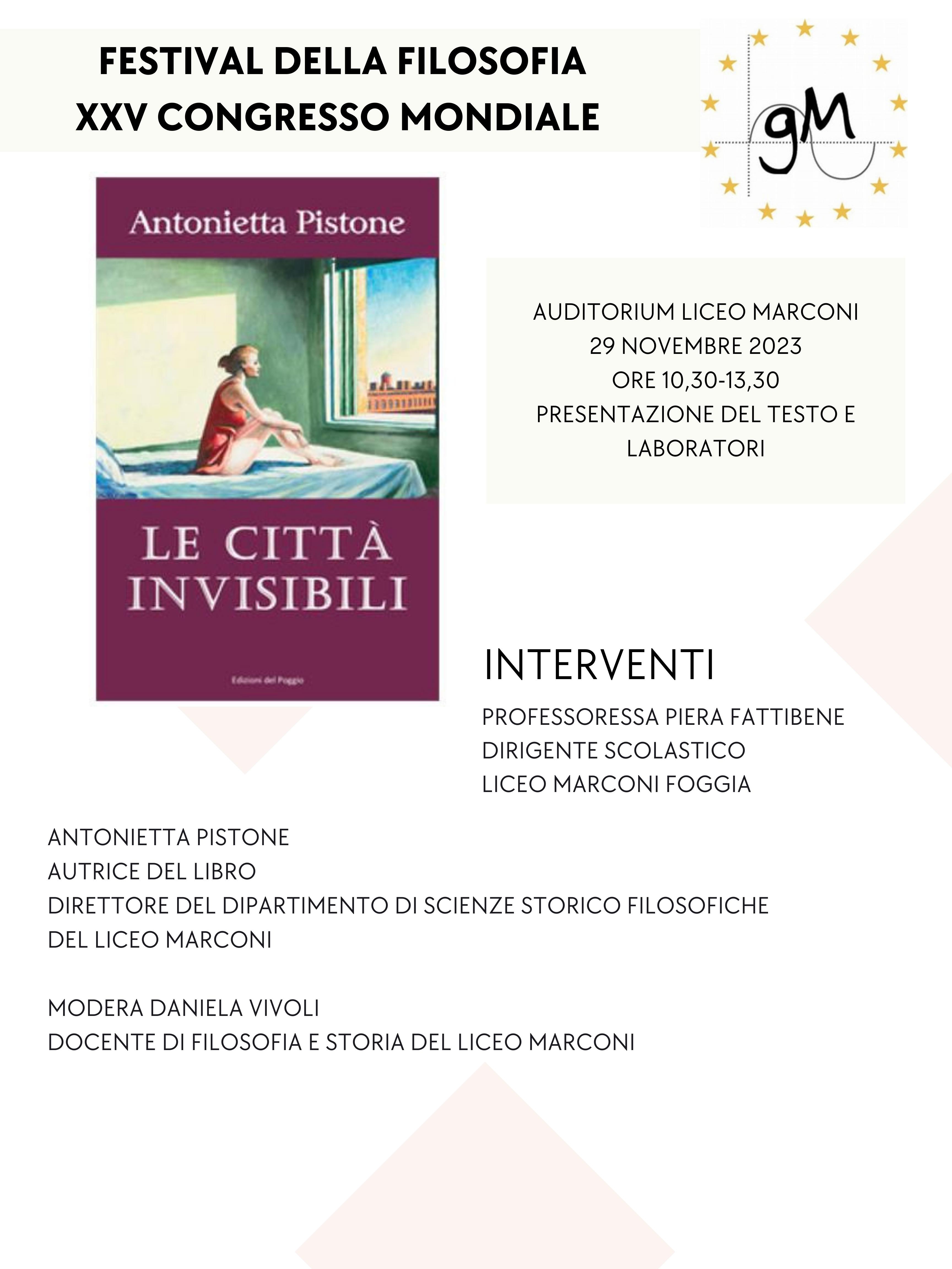 Il 29 Novembre prossimo, presso l’Auditorium del Liceo Scientifico G. Marconi di Foggia, si terrà il primo incontro del Festival della Filosofia, attività organizzata dal Dipartimento di Scienze Storico Filosofiche in preparazione al XXV Congresso Mondiale, che si svolgerà a Roma nel 2024. Ad aprire il programma, che prevede altri tre incontri tematici, cui prenderanno parte ospiti di spicco nel panorama culturale foggiano e nazionale, sarà un evento dal titolo Le Città Invisibili. Il tema trae il suo spunto dal nome di un libro pubblicato nel 2022 dalla professoressa Antonietta Pistone, direttore del dipartimento di Filosofia e Storia del Marconi. Ad introdurre la giornata sarà la dirigente, professoressa Piera Fattibene, che porgerà ai presenti i saluti di rito. L’incontro sarà moderato dalla professoressa Daniela Vivoli, docente di Filosofia e Storia del liceo, la quale presenterà il libro e avvierà le successive attività di laboratorio, che costituiranno una riflessione sul tema della città. Sarà presente l’autrice, per rispondere alle domande del pubblico.